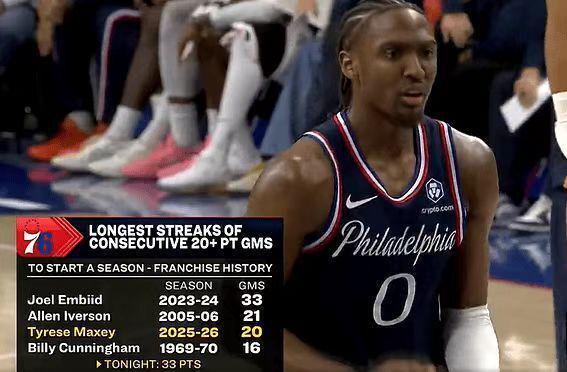 马克西迎来给力表现,他第三节狂轰20分,且已经连续20场得分20+位列队史第三位,仅次于恩比德连续33场与艾弗森连续21场。